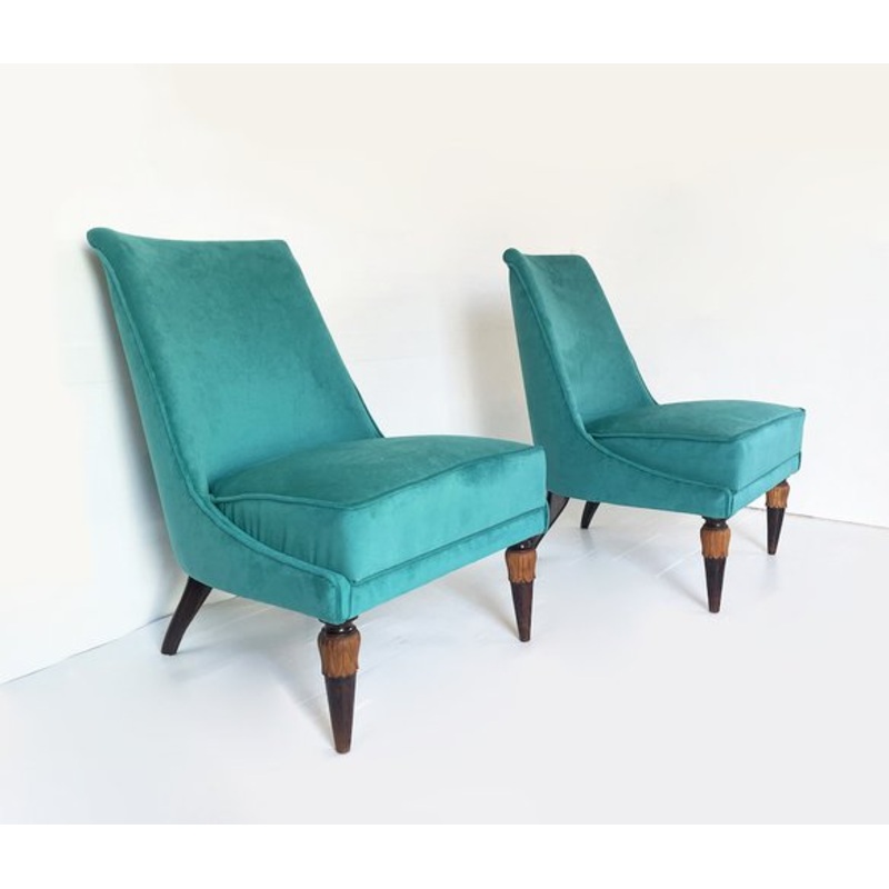 Particular pair of vintage armchairs with original beech structure and new teal-colored velvet upholstery. Dimensions: L 55 x D 60 x H70 x H seat 35 cm.Origin: ItalyEra: 1970 Design Period 1970 to 1979 Production Period Unknown Country of Manufacture Italy