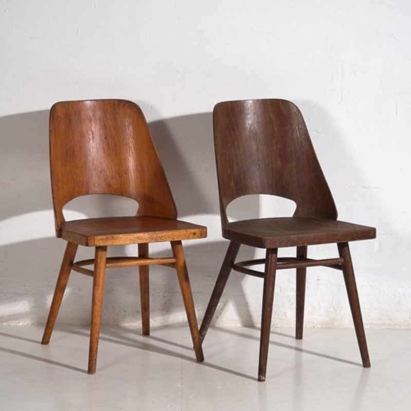 Vintage Thonet chairs (c.1950) Dimensions: Width: 42 cm Depth: 51 cm Height: 82 cm Seat: 46 cm Style: Mid 20th century modern Materials and techniques: Beech, curved wood Place of origin: Central Europe Epoch: Early twentieth century Date of manufacture: Circa 1950 Condition: Good. Wear consistent with age and use. Our vintage Thonet chairs are unique pieces that stand out for: Its timeless style blends perfectly with a variety of styles. One of the chairs retains the original seal of TON, the renowned Czech Republic company that inherited the tradition of the Thonet brothers, pioneers in the manufacture of bentwood furniture. Its versatile and timeless style can be the perfect complement to a dining table, living room or any contemporary space. The state of conservation is optimal, except for the characteristic imperfections of any antique furniture due to the course of the years. Give a point of originality to your home with these unique pieces, which merge with the contemporary style bringing personality to your home.