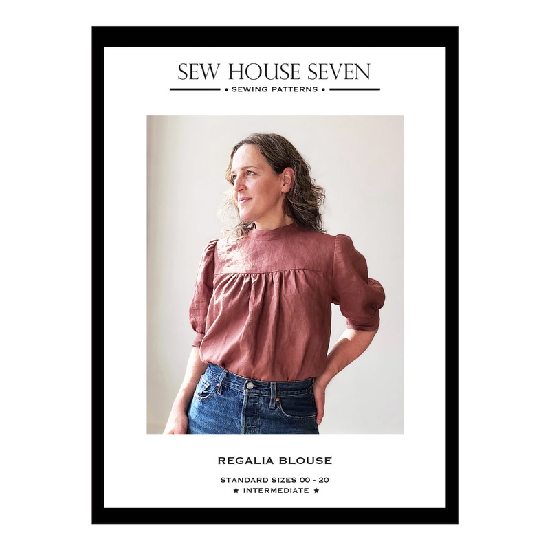 With all of its gathers, puffy sleeves and high collar, the Regalia still manages to look effortless and casual. The roomy fit of the bodice makes it so comfortable to wear. It pulls on over the head and ties at the back keyhole opening. It also features front and back yokes and a stand-up collar. There are two lengths andtwo sleeve designs to mix and match. Choose between a loose and flowy cropped hem to wear with high waist pants and skirts or a slightly longer tuck-in length blouse with an optional waist tie. The long sleeves (A) are gathered at the shoulder and narrow at the wrist while the short sleeves (B) are gathered at the shoulder and gathered into a cuff that lands just above the elbow. You can add an optional tulle sleeve head pouf to add a bit of volume to your sleeves. The Regalia looks best when sewn in a light-weight, woven fabric such as cotton voile or lawn but it also looks lovely in linen. Just be aware that looser weave fabrics such as linen and gauze will result in a slightly looser fitting garment.