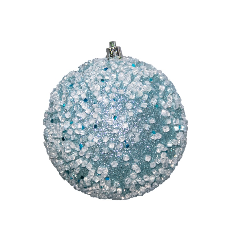 Shatterproof baby blue glitter w/hail ornament with wire.