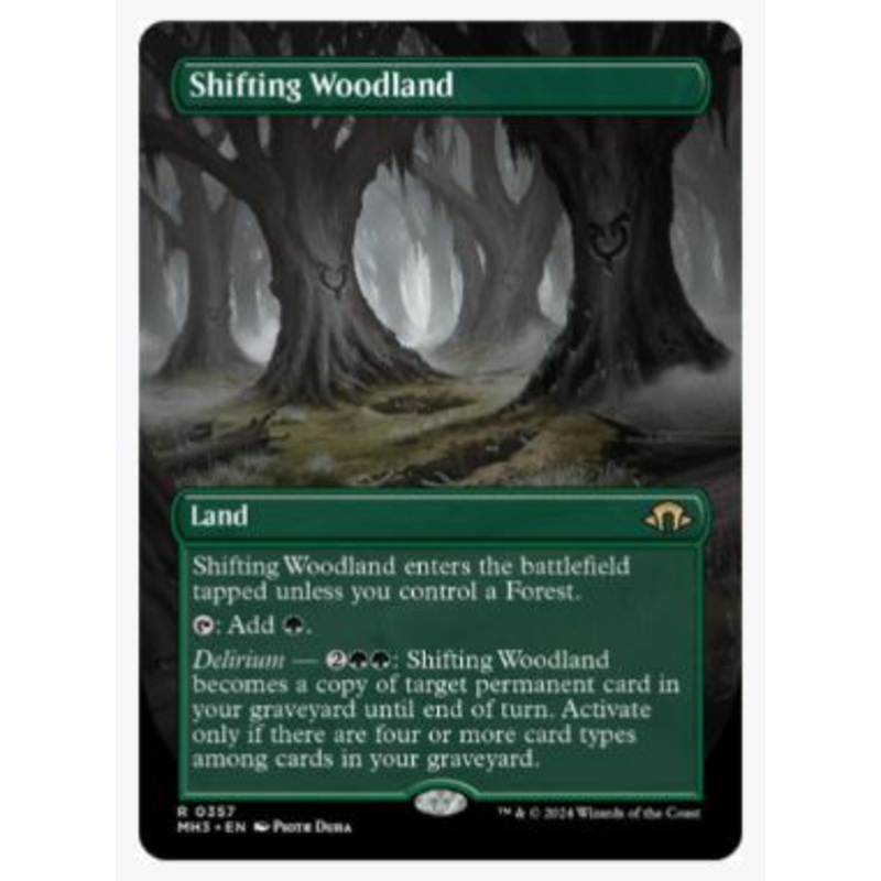 Shifting Woodland enters the battlefield tapped unless you control a Forest.T: Add G.Delirium2GG: Shifting Woodland becomes a copy of target permanent card in your graveyard until end of turn. Activate only if there are four or more card types among cards