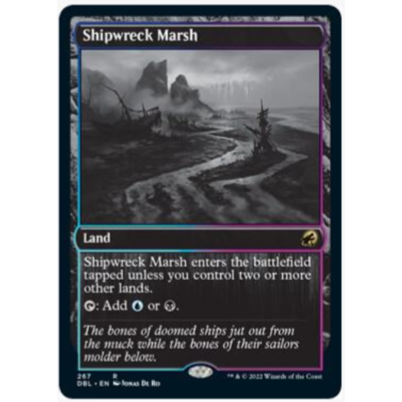 Shipwreck Marsh enters the battlefield tapped unless you control two or more other lands.T: Add U or B.Rarity:R#:267Card Type:LandFlavor:The bones of doomed ships jut out from the muck while the bones of their sailors molder below.