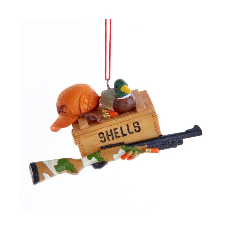 This shotgun shell with duck hunting ornament from Kurt Adler is a unique addition to your holiday dcor or Christmas tree. This ornament features a box of "Shells" with a shotgun, hat and duck.