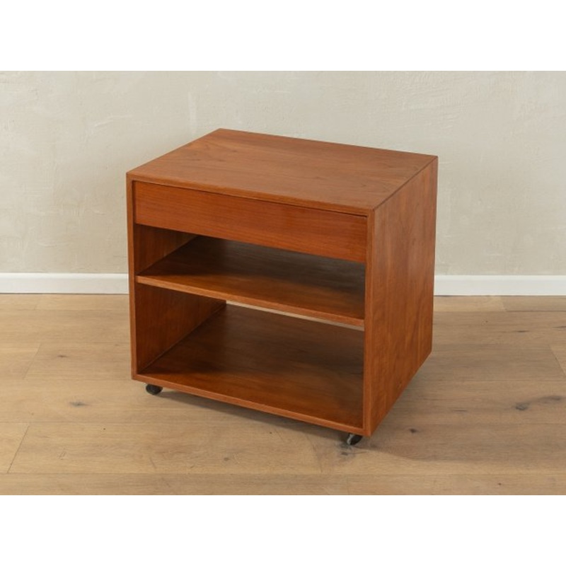 Classic side table from the 1960s. Body in teak veneer with solid wood edges and a shelf in teak veneer, a drawer and plastic wheels.Quality features:very good workmanshiphigh quality materialsgalvanized solid wood drawerMade in Denmark Design Period 1960