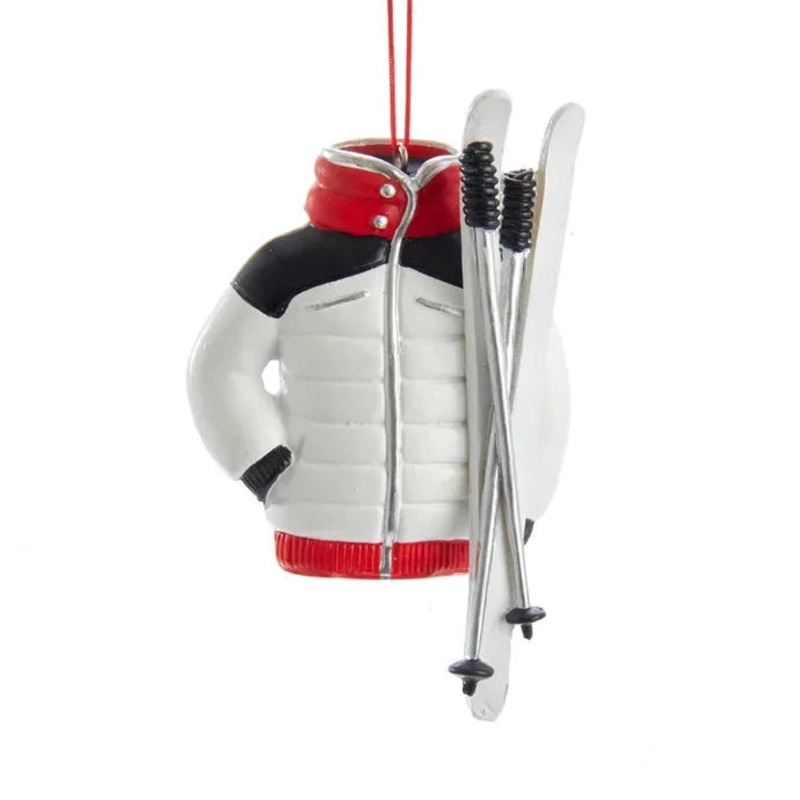 Kurt Adler's ski jacket ornament is a fun addition to your home or holiday dcor. It features a red, white and black ski jacket with white skis and silver poles.