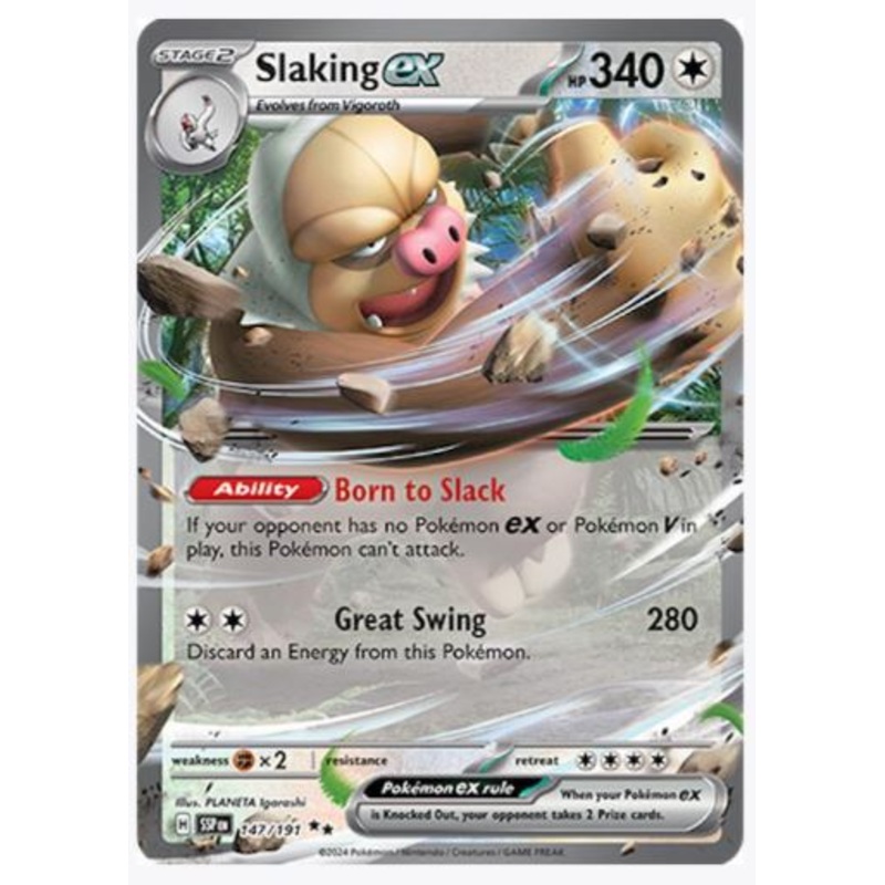 Card Number / Rarity:147/191 / Double RareCard Type / HP / Stage:Colorless / 340 / Stage 2Card Text:Ability: Born to SlackIf your opponent has no Pokmon ex or Pokmon V in play, this Pokmon can't attack.Attack 1:[CC] Great Swing (280)Discard an Energy from