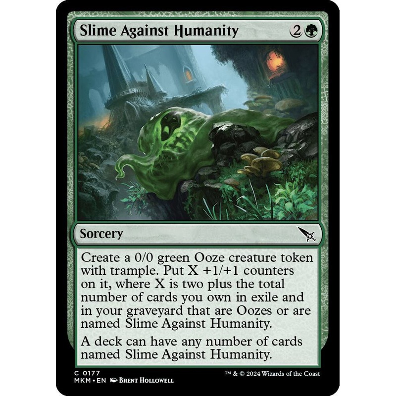 Create a 0/0 green Ooze creature token with trample. Put X +1/+1 counters on it, where X is two plus the total number of cards you own in exile and in your graveyard that are Oozes or are named Slime Against Humanity.A deck can have any number of cards nam