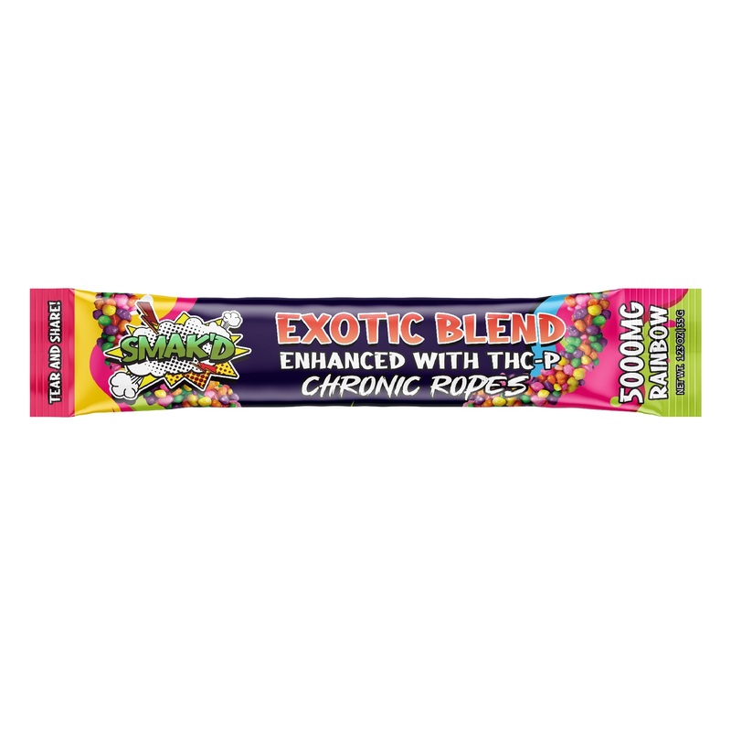 Satisfy your sweet tooth and elevate your experience with Smakd TKO Exotic Blend Candy Rope – 5000mg! Indulge in a delicious gummy rope wrapped in colorful candy clusters, packed with 5000mg of Delta 8, THC-P, and HHC for a potent blend. Tear and share with friends for a truly exotic treat.