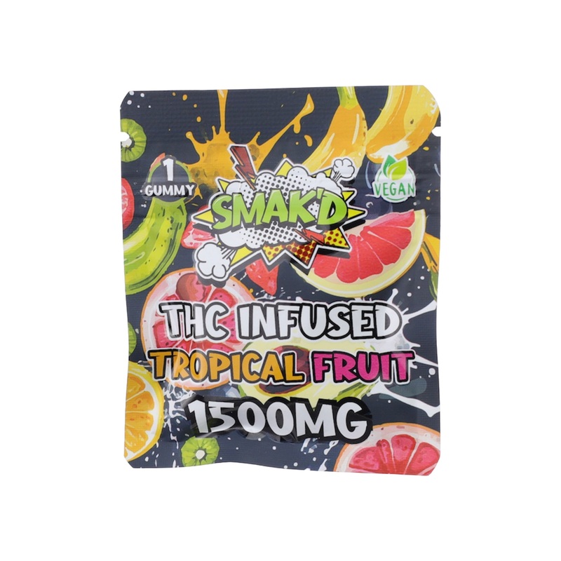 Tropical Fruit Flavored Delta 8 + HHC Infused Gummy 1500mg per gummy Delta 8 and HHC infused Tropical Fruit flavor Potent Fast acting Description Indulge in a playful twist on the classic gummy with Smakd Tropical Fruit Delta 8 + HHC Gummy! Each gummy cont