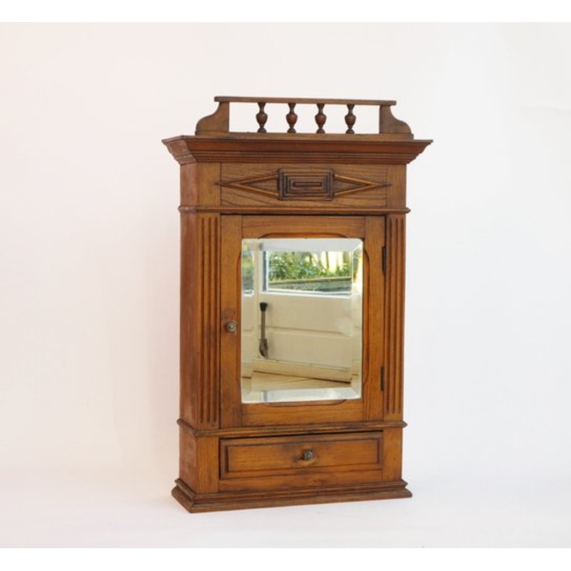 Amazing antique oak wall cabinet with a beveled mirror on the front door. It has a nice carved floral ornament on the top as well as a fence like decoration. The drawer on the bottom is also nicely decorated.In the inside there is space to store your items