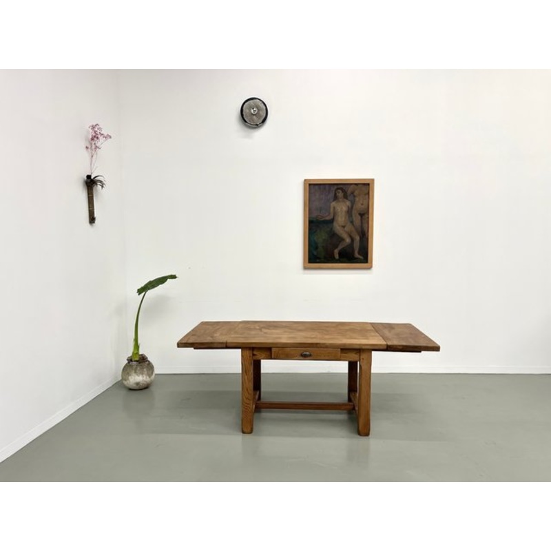 Small rustic farm table with extensions in solid elm from the 80s. This table without its extensions has mini dimensions which allow it to fit into small spaces. But once its two extensions are deployed, it becomes a large, very stable table measuring more than 2 meters. Offered here fully restored and varnished.