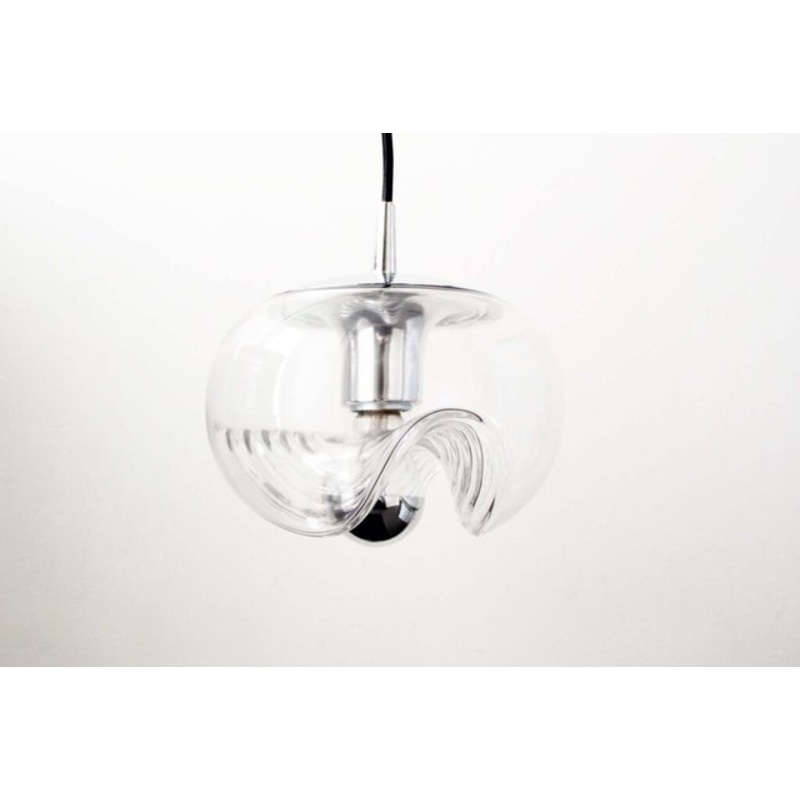 Chrome & Glass Futura pendant lamp. Designed by Koch & Lowy for Peill & Putzler, Germany 1970s. In great and fully original condition, minimal signs of age. Emits a beautiful and playful light when in use thanks to the unique shape of the glass. Electricity has been replaced