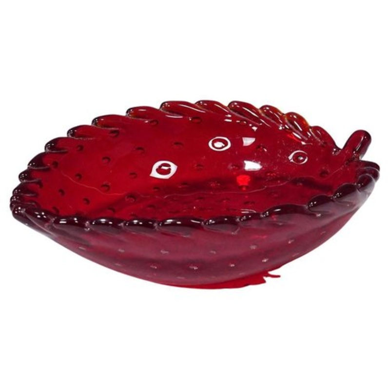 Small Leaf Bowl by Tyra Lundgren for Venini Small leaf bowl made of red glass with regular air bubble decoration and a pinched rim. Designed by Tyra Lundgren in the 1930s, manufactured by Venini, Venice. Round acid stamp ‘Venini Murano Italy’ on the base. Model no. 2700. Tyra Lundgren (1897 1979) was a Swedish painter, ceramist, glass and textile designer. In 1936, she met the glassmaker Paolo Venini at the Triennale di Milano. He invited her to Murano and she became the first woman to design glass for Venini. Her bird, fish and snake sculptures belong to the most seeked Venini glasses. In 1938 and 1948 her designs for Venini were exhibited at the Venice Biennale. Lundgren also worked as glassware designer at Moser, Karlsbad, Riihimki, Finnland and Kosta, Sweden. In 1950, she was awarded the Swedish royal medal Litteris et Artibus in recognition of her artistic career. artfour is an owner-managed trading company dealing with fancy pieces of Murano and Scandinavian art glass. Our passion for the beauty of these works of art drives us to become your preferred partner for the expansion of your collection. We have been dealing with 20th century art glass since the 1980s and have great experience. We guarantee the authenticity of all items we offer. We operate worldwide with well-packed and money back guarantee service. Measures: Length: 4.92″ (12.5 cm) Width: 3.74″ (9.5 cm) Height: 1.3″ (3.3 cm) Literature Reference: Franco Deboni, Venini Glass Volume 1, Turin 2007, blue catalog, page 52