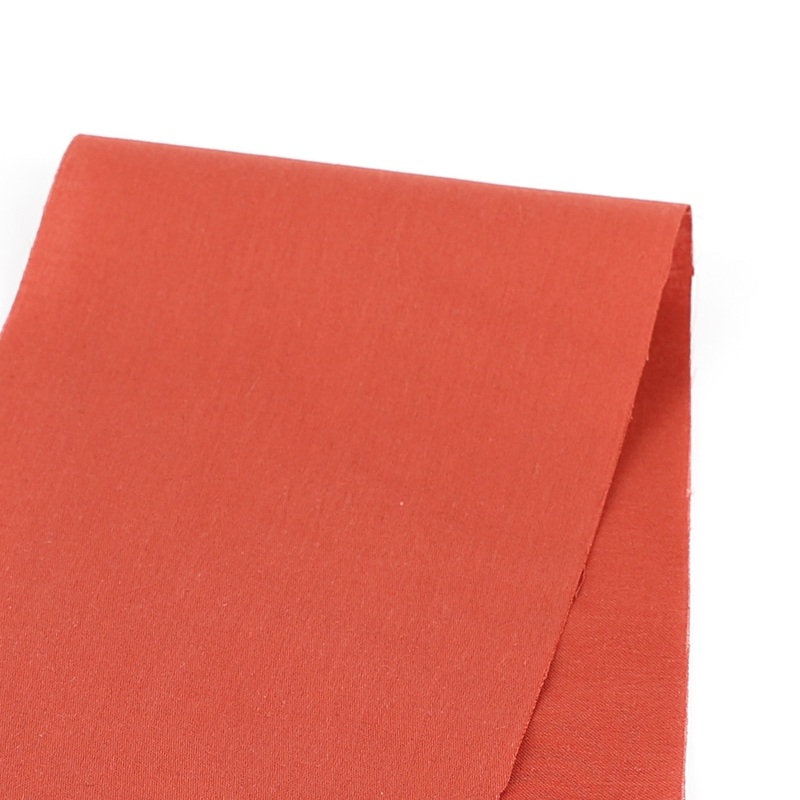 A deadstock pure cotton in a terra rosa red. This lightweight fabric has been woven in a tight very subtle twill giving a slight sheen on the face. This cotton has a crisp drape and a smooth finish. A smooth, semi-transparent fabric with no stretch ideal for loose-fitting styles, childrenswear, dresses like the Ivy, and sets like the Sparrow.