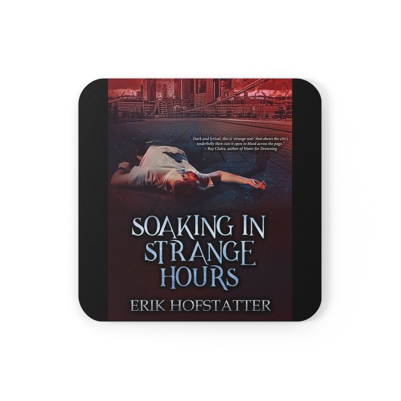These coasters are made with a high-gloss top and feature a cork back to prevent sliding, and each order comes with a set of four coasters. The cover art in these coasters is from Erik Hofstatter’s book, Soaking in Strange Hours.