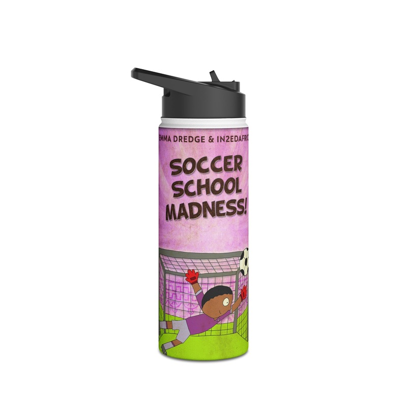 Quench your thirst in style with this 18oz stainless steel water bottle featuring a double-wall stainless steel build that keeps your drinks frosty for 24h and soothingly hot for 12h. This BPA-free, steel water bottle comes with a twist-on lid for easy sipping, making it excellent for daily use at work, at college, in the car, and beyond. The cover art in this water bottle is from Emma Dredge’s book, Soccer School Madness!.