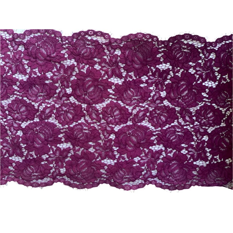 13"/33 cm wide Alenon lace in boysenberry, with a classic all-over repeat. This exquisite corded Alenon lace trim has beautiful eyelash edging on both sides. 80% viscose and 20%poliamide blend.Made in France for Solstiss.