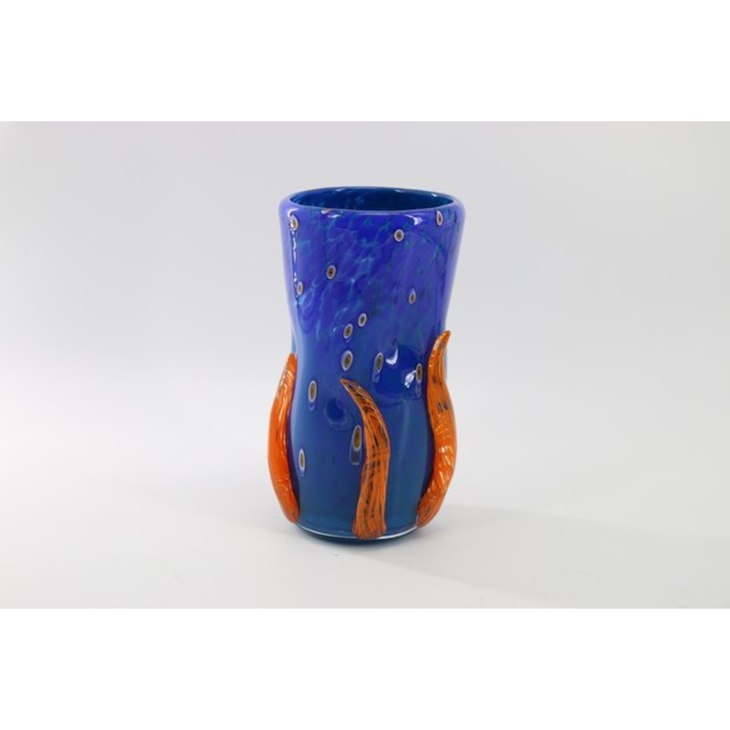 This stunning Murano glass vase is handcrafted using traditional glassblowing techniques and expertly hand-finished by two skilled glassmasters working simultaneously, ensuring that no two pieces are ever exactly alike. The vase features deep blue tones, with aquamarine shining through the midnight blue grains, creating a captivating depth of color. Murrine patterns adorn the surface, adding intricate detail, while a striking orange relief, resembling flames, wraps around the vase. This dynamic design creates a contemporary and unique visual effect, making the vase a truly special piece that adds sophistication and artistry to any space.