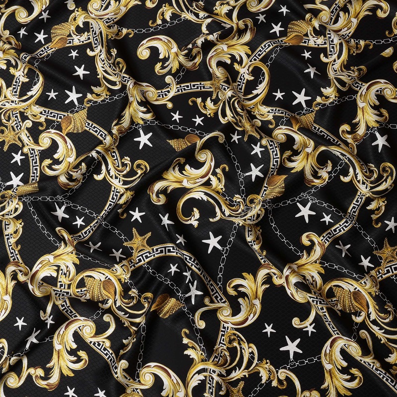 Embrace luxury and sophistication with this pure silk satin jacquard fabric, meticulously crafted in South Korea. This stunning fabric features a regal Baroque design in rich gold and white, intricately woven against a deep black background. The ornate swirls and elaborate chains are beautifully complemented by scattered white stars, creating a bold, elegant contrast that adds a touch of opulence to any creation. The jacquard weave provides subtle texture, enhancing the fabric’s natural sheen and silky smooth feel. This luxurious fabric drapes beautifully, making it ideal for high-end garments such as evening gowns, jackets, and accessories. With its 150 cm width, this fabric is also versatile enough for statement-making home dcor projects, bringing a sophisticated, artistic flair to curtains, upholstery, and more. Crafted from 100% pure silk, this fabric delivers unparalleled softness, breathability, and comfort, all while showcasing the finest in South Korean craftsmanship.