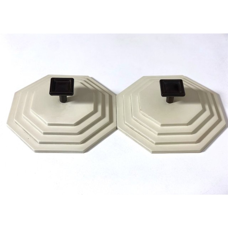 Splendid set of Beige coat hangers from the 70s, with a geometric and futuristic design inspired by the Spage Age style. Multi-level octagonal shape with a three-dimensional effect, accentuated by the contrast between the colors and the square knob. These coat hangers represent an icon of 70s pop design, made of rigid ABS plastic, perfect for adding a retro and original touch. PERFECT CONDITIONS Measurements: Width and height 27.5 cm – Depth 9 cm