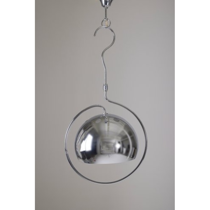 Space age style chrome metal pendant light. This pendant light is made up of a chrome tubular structure which supports the chrome spherical diffuser, also perforated on the top, bringing warm light to any space. Very good condition.
