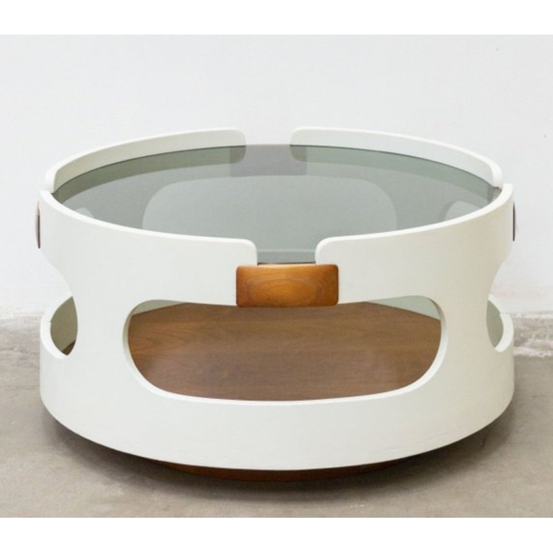 Round coffee table in beech wood from the 60s/70sOne part made of wood and one painted cream whiteSmoked glass shelfIn good condition with some signs of use, we cleaned it carefully for conservation purposesDimensions: diameter 71.5 cmheight 35 cmglass dia