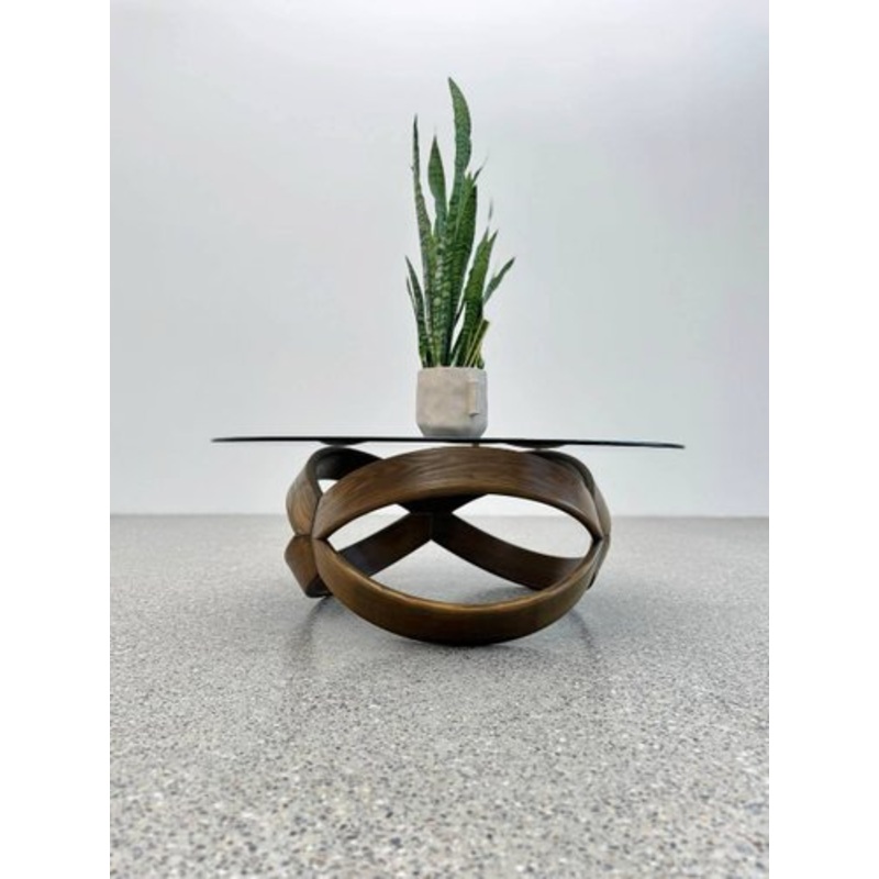 The table features a round glass top with a slightly blue-gray tint, creating a sophisticated, almost floating effect. The base frame is a true design icon – it is made of curved wood with an intricate, flowing shape that combines dynamism and stability. The harmonious combination of glass and wood creates a unique visual experience and makes this table a real eye-catcher in any interior.