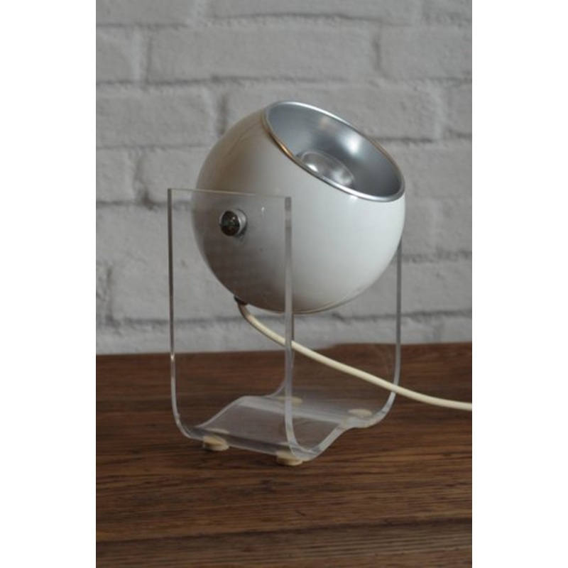"DP Design" lamp.White metal lampshade and transparent acrylic frame.Lampshade can be rotated 180 degrees.Switch is on the cable. E14 socket.Used condition, with slight scratches and small dents on the shade,which, however, do not take away from the charm