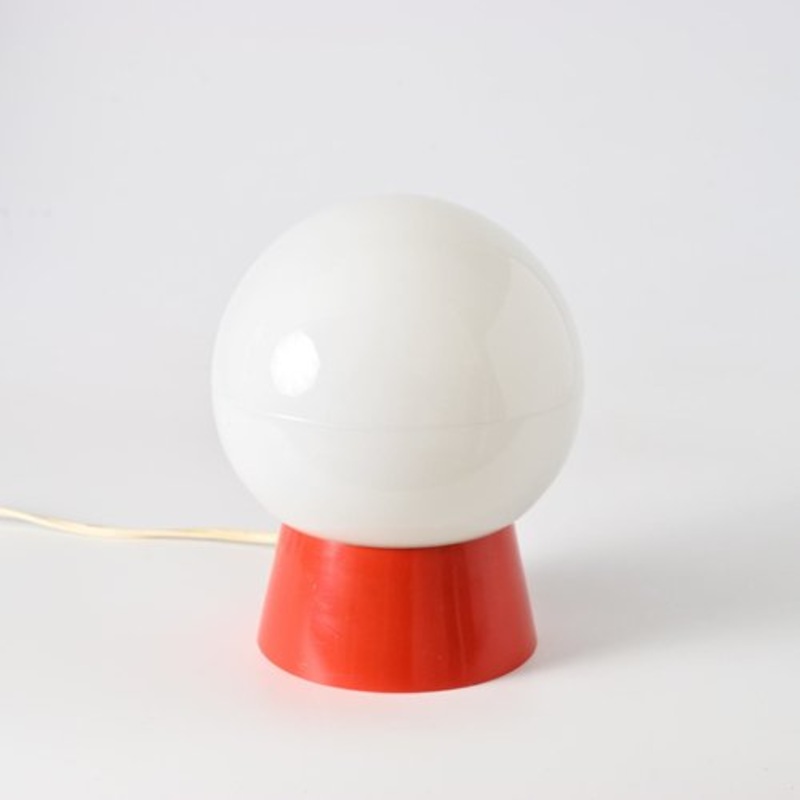 Space age table lamp made of orange painted plastic base and white opaline glass globe. Lamp uses one lightbulb type E27. Base diameter: 12 cm Design Period 1960 to 1969 Production Period 1960 to 1969, 1970 to 1979 Country of Manufacture Sweden Style Vinta