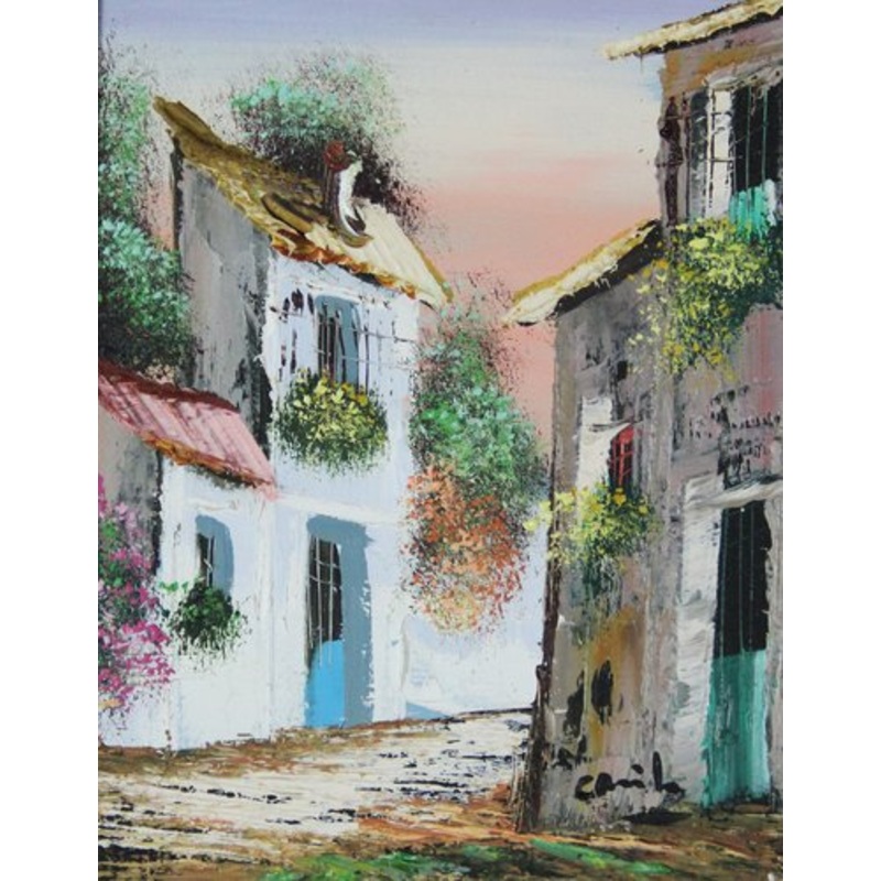 Spanish street, oil painting on canvas was created with a mixed palette of fine quality paint. The artist used the brush technique and managed to reach a high level of detail on the piece. The painting is spread on a natural canvas placed on a wooden back frame.