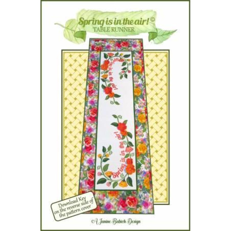 Spring translates earth’s happiness into colorful flowers.’ Create your own translation of springtime happiness when you stitch this lovely table runner featuring a wandering vine bedecked with appliqued leaves, budding blooms, 3D flowers and a reminder that ‘Spring is in the air!’ Includes embroidery formats: DST, EMB, EXP, HUS, JEF, PCS, PES, SEW, SHV, VIP, VP3, XXX. SVG & JPEG images & applique patterns included. Requires a 5 1/2″ x 9″ hoop. Finished size: 14″ x 43″