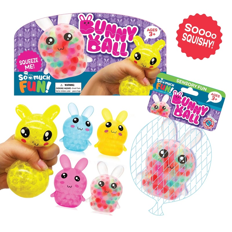 Cute bunny shaped 4 water bead balls contain soft squishy water beads that can be squished & squeezed to help relieve stress or anxiety, promote focus and reduce tension. Assorted colors; multi-color, light blue, yellow and pink. Twelveindividually mesh-bagged ballsper innerboxwith toy bin card included for use on theSo Much FUN! Toy Bin Programcorrugated display or in the clear toy bin pockets. Product fits short or tall bins.