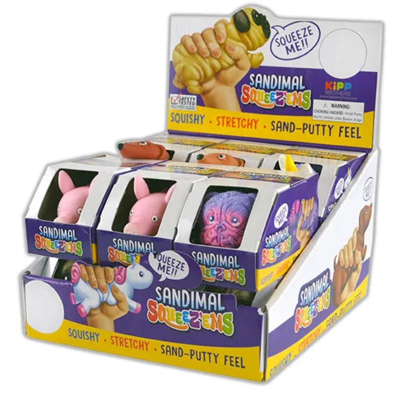 Sandimal Squeez'ems are stretchy, squishy, and adorable! Get the feel of playing with sand-putty, but without the mess! Comes in several cute animal designs.For children ages three and up. Safety tested, meets current consumer product safety standards. UOM