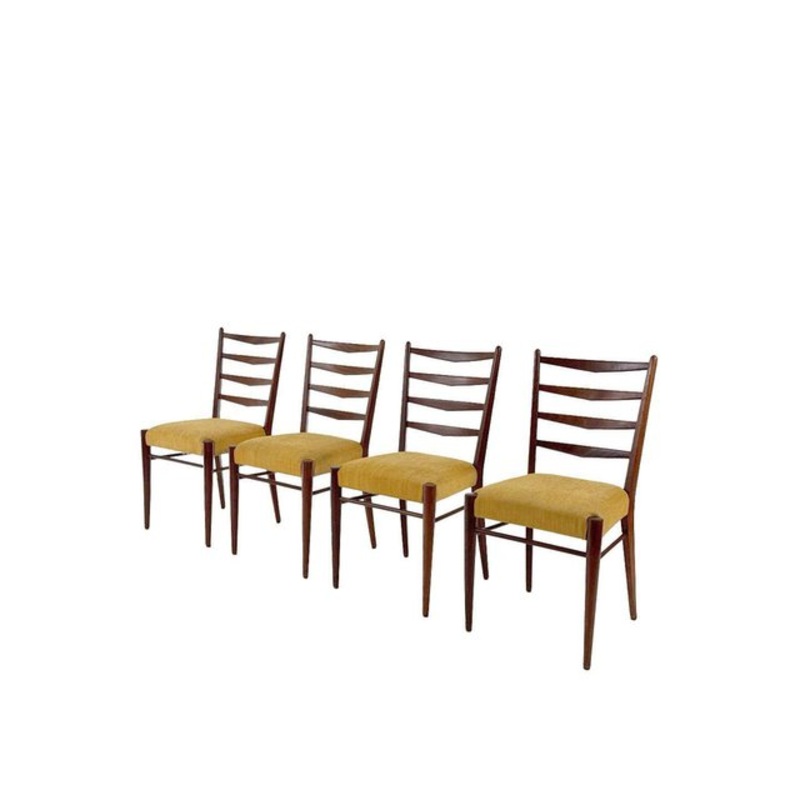 The chairs are made of teak wood and have an ocher yellow upholstered seat. Thanks to the slightly curved backrest, they offer excellent seating comfort.