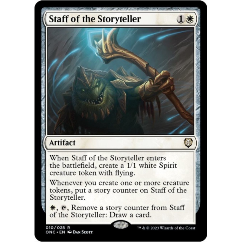 When Staff of the Storyteller enters the battlefield, create a 1/1 white Spirit creature token with flying.Whenever you create one or more creature tokens, put a story counter on Staff of the Storyteller.W, T, Remove a story counter from staff of the Story
