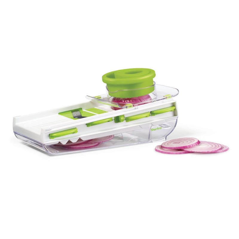 The Starfrit Easy Mandoline is the perfect kitchen tool to crinkle, slice, julienne, grate or shred quickly and easily!The kitchen mandoline is great when small and even cuts are needed for your favorite recipes.5 different blades to crinkle, slice, julien