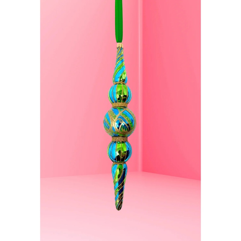 Striped. Spiraled. Unapologetically kinetic.This one doesnt stand still. Decked in electric blue and green with ribbons of glittered gold, its a modern twist on traditionlike a vintage carnival ride kissed by couture. Spiraling joy from every angle, its th