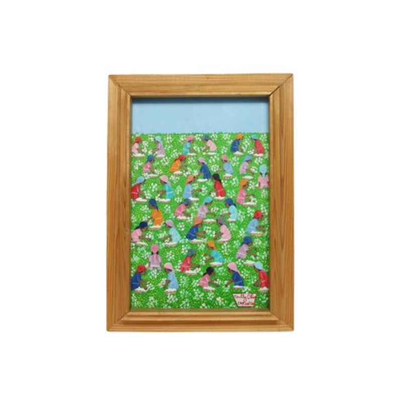 A simple wooden frame enhances the rustic and authentic character of the piece. The painting radiates an atmosphere of optimism, celebrating community and labor in nature. The artists signature and the inscription Cap Hatien highlight the cultural origins of the work, referencing the northern region of Haiti, known for its rich artistic traditions.