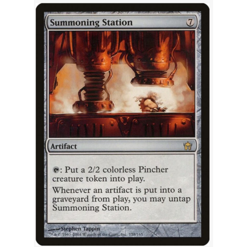 T: Put a 2/2 colorless Pincher creature token into play.Whenever an artifact is put into a graveyard from play, you may untap Summoning Station.Rarity:R#:158Card Type:ArtifactCasting Cost: 7