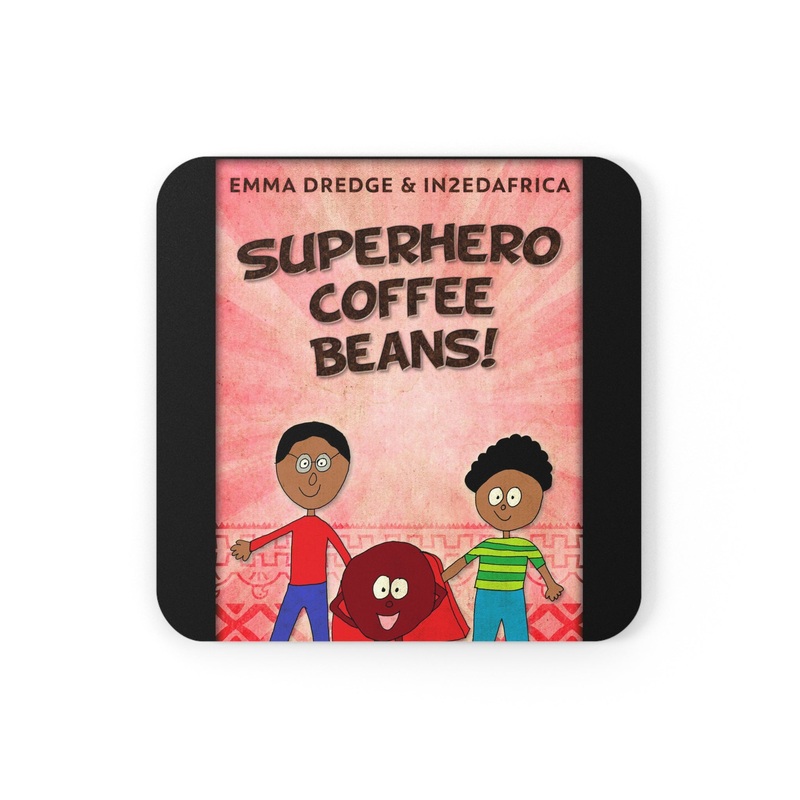 These coasters are made with a high-gloss top and feature a cork back to prevent sliding, and each order comes with a set of four coasters. The cover art in these coasters is from Emma Dredge's book, Superhero Coffee Beans!.