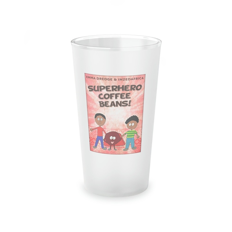 This frosted matte finish pint glass is versatile and dishwasher-safe. The cover art in this pint glass is from Emma Dredge's book, Superhero Coffee Beans!.