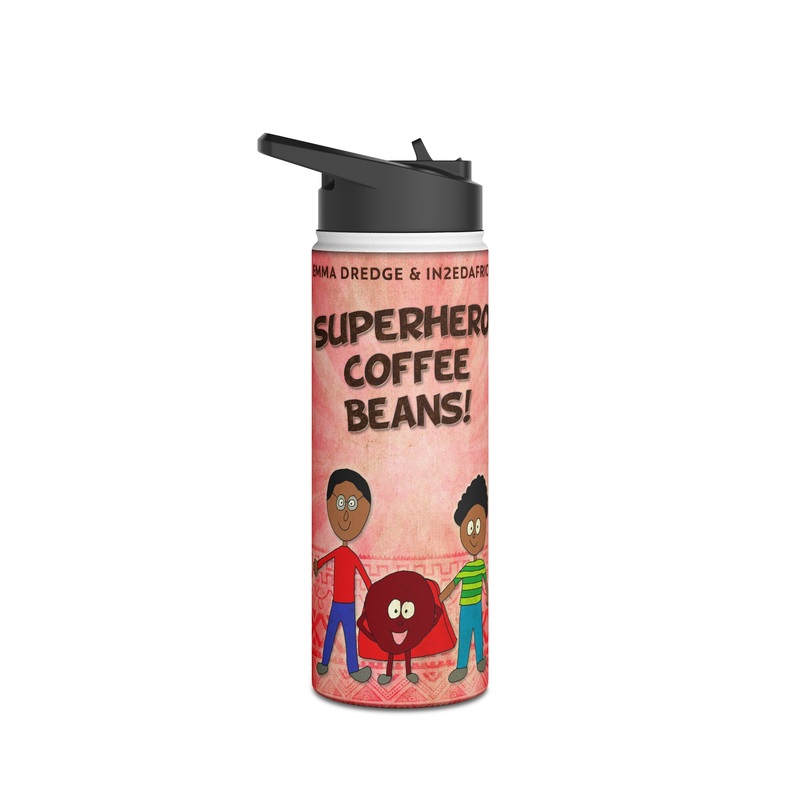 Quench your thirst in style with this 18oz stainless steel water bottle featuring a double-wall stainless steel build that keeps your drinks frosty for 24h and soothingly hot for 12h. This BPA-free, steel water bottle comes with a twist-on lid for easy sipping, making it excellent for daily use at work, at college, in the car, and beyond. The cover art in this water bottle is from Emma Dredge’s book, Superhero Coffee Beans!.