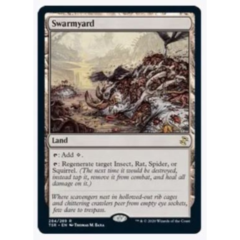 T: Add C.T: Regenerate target Insect, Rat, Spider, or Squirrel.(The next time it would be destroyed, instead tap it, remove it from combat, and heal all damage on it)Rarity:R#:284Card Type:Land