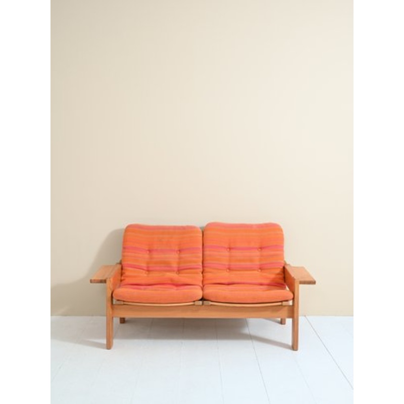 Two-seater sofa by Yngve Ekstrm for Swedese, with pine structure and original orange and pink striped cushions.
