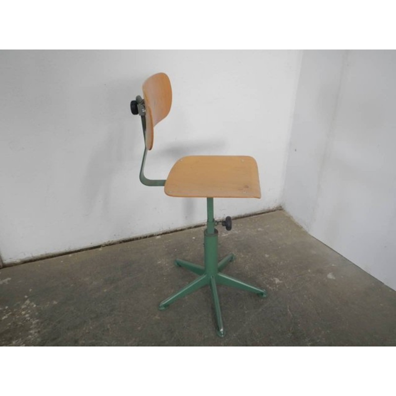 Light wear consistent with age and use, Patina consistent with age and use, Sgabelloa 5 gambe con schienale e seduta in laminato di faggio. Lo schienale reclinabile. La seduta misura cm 35×35. Regolabile manualmente da cm 61 a cm 47
