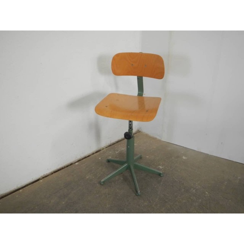 Light wear consistent with age and use, Patina consistent with age and use, Sgabello in ferro verde 5 gambe con schienale e seduta in laminato di faggio. Lo schienale reclinabile. La seduta misura cm 40×40. Regolabile manualmente da cm 61 a cm 47