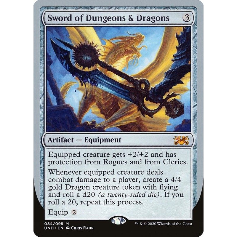 Equipped creature gets +2/+2 and has protection from Rogues and from Clerics.Whenever equipped creature deals combat damage to a player, create a 4/4 gold Dragon creature token with flying and roll a d20. If you roll a 20, repeat this process.Equip 2Rarity