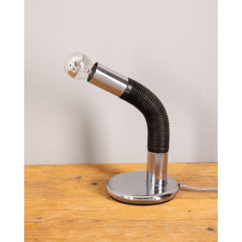 Table lamp in chromed metal and black plastic, flexible and adjustable, design Mario Bellini for Targetti, 1970s. Creator Mario Bellini Manufacturer Targetti Design Period 1970 to 1979 Production Period Unknown, 1970 to 1979 Country of Manufacture Italy Id