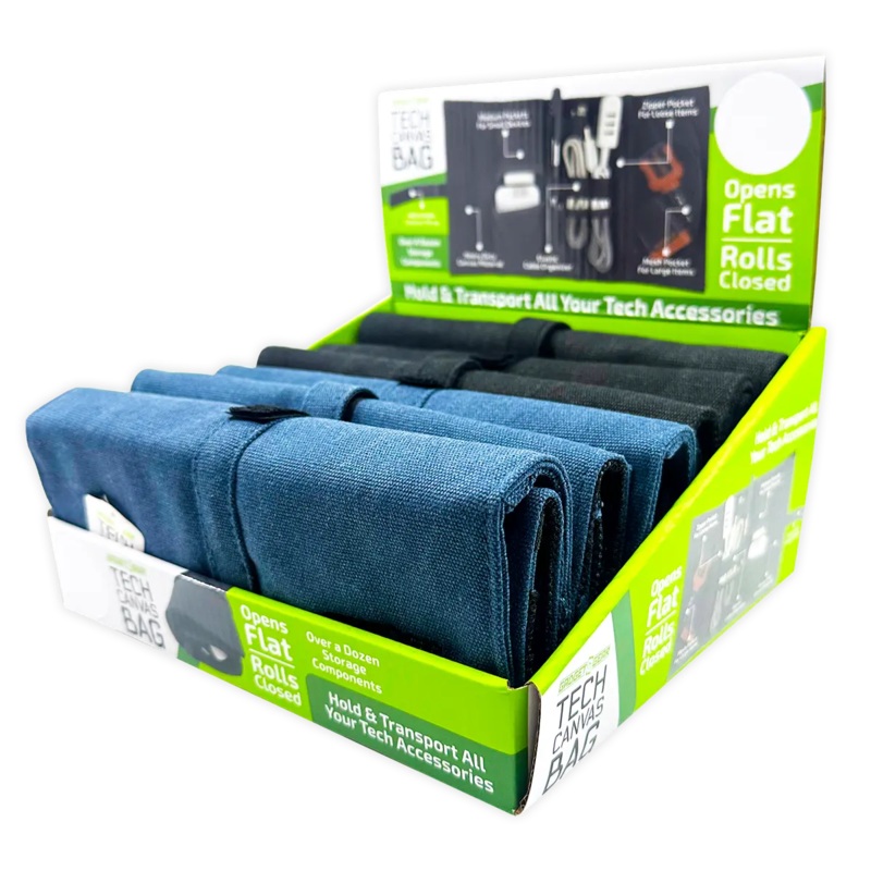 Gadget Gear’s Tech Canvas Bag OPENSFLAT, ROLLS CLOSED!Offers over a dozen storage components zipper pocket for loose items, medium pockets for small devices, mesh pocket for large items, elastic cable organizers and adjustable closure strap. Made with heavy duty canvas material. Hold and transport all your tech gear!