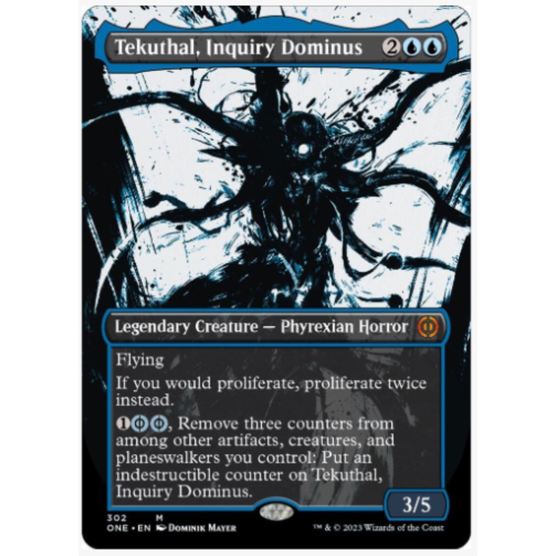 FlyingIf you would proliferate, proliferate twice instead.1(U/P)(U/P), Remove three counters from among other artifacts, creatures, and planeswalkers you control: Put an indestructible counter on Tekuthal, Inquiry Dominus.((U/P) can be paid with either U o